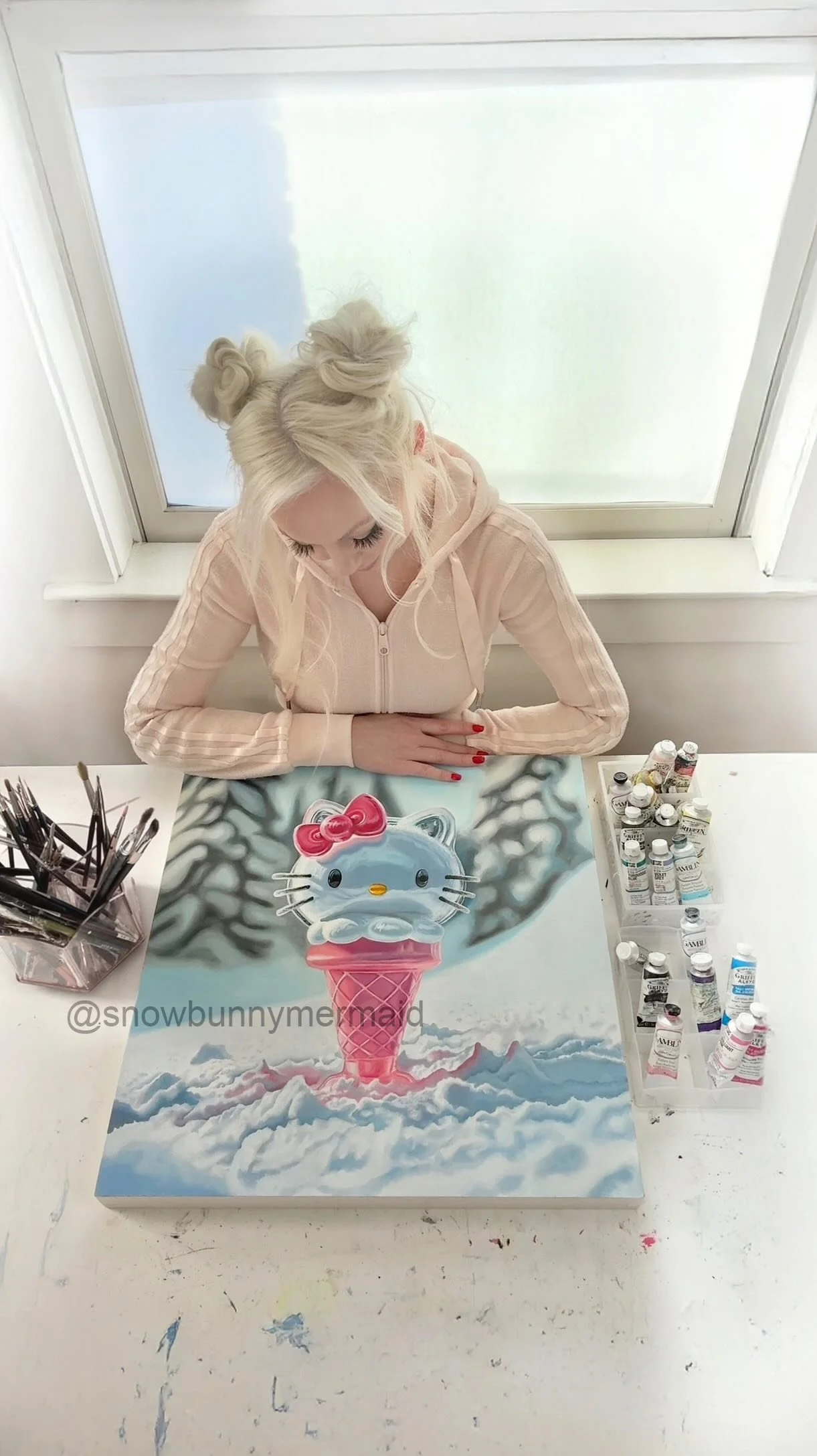 Alison’s work is playful and surreal, but always with an undercurrent of tenderness and fragility. She explores contrasts in her work such as whimsy against gothic undertones. She brings these elements to life through painting, drawing, and intaglio printmaking, often tucking them into handmade or vintage frames. The ornate frames add a theatrical, almost whimsical stage for the characters to play on. Outside the studio, Alison is a professional mermaid and sets up submerged cameras to capture artistic underwater videos, and photographs of her mermaid swimming.